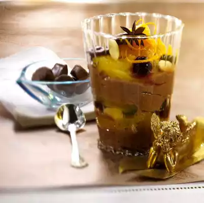 Cut out the fillets between the separating skins. Peel the clementines, divide into slices and peel off the fine white skin. Cut the Amarena cherries in half. Remove spices from the orange juice. Add orange filets, clementines, pistachios, almonds, Amarena cherries, 1 tablespoon orange liqueur and honey to the lukewarm orange juice. Put the chocolate mousse in a piping bag with a medium perforated spout. Before serving, layer the praline mousse and fruit alternately in 4 glasses and decorate each with a star anise and orange zest