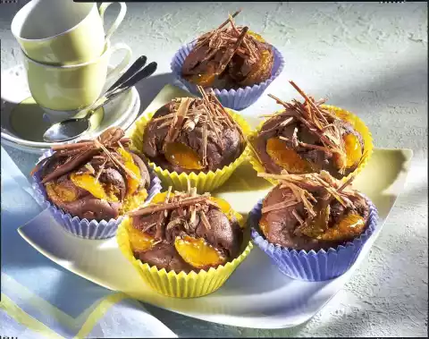 Melt the chocolate and spread it on a smooth marble or porcelain plate. Allow to set and use a wide spatula to make rolls or shavings. Cool briefly, decorate muffins with it