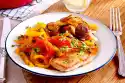 Cut the cake into about 20 cube-shaped pieces. Serve with strawberries, juice and vanilla cream. Halve the rest of the strawberries and decorate the pieces with them.