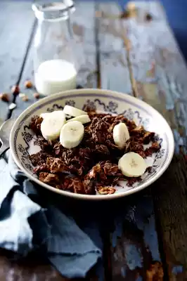 Pour cooled muesli into a large, easy-to-close glass jar. Close well. Serve with fruit (e.g. banana) and milk