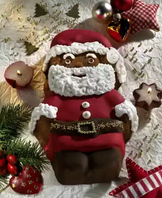 Stir the flour mixture and orange juice briefly into the dough. Grease a Santa Claus mould (27 cm high). Fill in the dough and smooth it down. Bake in the preheated oven (electric cooker: 175 °C/ convection oven: 150 °C/ gas: level 2) for about 60 minutes. Take out the cake and let it rest in the pan for 3 minutes. Carefully turn out and let cool down. Mix icing sugar, egg white and 2-3 tablespoons of water. Pour 2 heaped tablespoons into a freezer bag. Cut off a small corner. Colour 2 tablespoons of white icing brown with cocoa powder. If necessary, mix the icing with 1 teaspoon of water. Colour the rest of the icing red with food colouring.