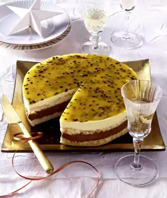 Soak 1 sheet of gelatine in cold water. Halve the passion fruit and remove the pulp. Simmer the pulp and jelly for about 1 minute, then remove from the heat and allow to cool for about 5 minutes. Dissolve squeezed out gelatine in it, then let it cool lukewarm. Pour the jelly onto the surface of the cake. Chill the cake for at least 3 hours. Remove from the cake ring and serve