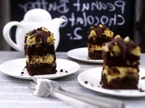Melt 100 g chopped chocolate in a hot water bath and let it cool down a little. Cut the chocolate-peanut cake into approx. 28 cubes (approx. 5 x 5 cm). Run some liquid chocolate over each cube.
