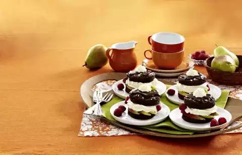 Spray sour cream onto the pears, except for something to decorate. Place the remaining cookies on top and decorate with the remaining sour cream. Arrange on plates and possibly decorate with raspberries.