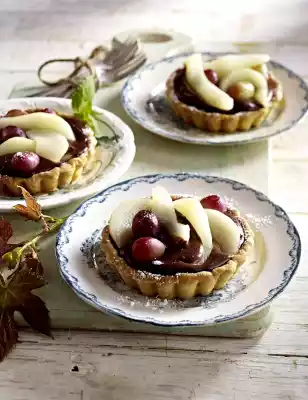 Then bake in the preheated oven (electric oven: 200 °C/ convection oven: 175 °C/ gas: level 3) for 18-20 minutes on the bottom rack. Remove from the oven, place on a cake rack and allow to cool for about 20 minutes. Remove the tartlets from the ramekins and let them cool on a cake rack. In the meantime, roughly chop the chocolate. Heat the cream in a pot, add the chocolate and dissolve it while stirring. Chill for about 1 hour until the chocolate cream begins to set.