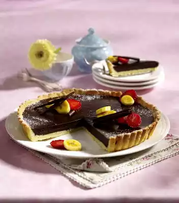 Place the mould in a cool place for approx. 1 hour. Place baking paper on the dough, add dried peas. Bake in the preheated oven (electric cooker: 200 °C/ convection oven: 175 °C/ gas: level 3) for about 15 minutes. Remove dry peas with baking paper, bake for another 10-15 minutes, let cool off. Chop the chocolate. Heat the cream and melt the chocolate in it. Let it cool down for about 45 minutes, stirring again and again. Pour cream into the tin and chill for at least 4 hours. Dust the tart with icing sugar.