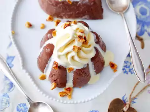 Spray one tuff vanilla ice cream on each pudding and sprinkle with roasted hazelnuts.