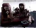 Colour orange with food colouring. Cover the pumpkin all around with it and let it dry. Cut out eyes and mouth from paper (round or square as you like). Carefully pin the pumpkin onto the icing of the pumpkin with pins. Score the icing with a small kitchen knife, remove the paper and carefully lift the icing out until it reaches the surface of the cake. Arrange the cake on a paper doily