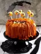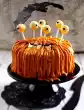 Cover the cakes with aluminium foil about 10 minutes before the end of the baking time. Then take them out of the oven, place them on a grid and let them cool in the mould for about 40 minutes. Carefully turn out of the tin and let it cool down on a grid. Warm the jelly in a small pot and let it cool down for about 10 minutes. Spread the jelly on the smooth side of one cake, place the second cake on top to form a pumpkin. For the icing, sieve icing sugar into a bowl. Mix the icing sugar, egg white and orange juice with the whisk of the hand mixer. Colour orange with food colouring. Cover the pumpkin all around with it and let it dry. Cut out eyes and mouth from paper (round or square as you like). Carefully pin the pumpkin onto the icing of the pumpkin with pins. Score the icing with a small kitchen knife, remove the paper and carefully lift the icing out until it reaches the surface of the cake. Arrange the cake on a paper doily