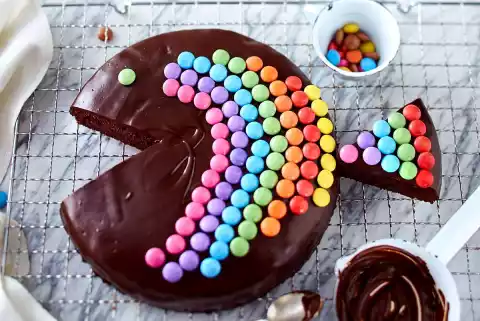 For the decoration heat cream and coconut oil in a pot. Divide the chocolate into pieces and melt in them. Stir well. Cover the cake with the icing and let it dry for about 5 minutes. Cut a triangle out of the cake and place it on the opposite side with the tip as a fin. Decorate the cake with the chocolate lentils and leave to dry.
