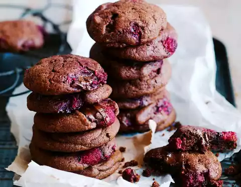 Finely chop the chocolate. Cream butter, sugar, egg and vanilla flavouring with the whisks of the mixer. Mix flour, baking powder, cocoa and baking soda and stir in portions briefly. First add the chopped chocolate, then the raspberries.