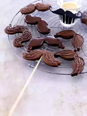 Re-heat the rest of the chocolate and put it in a freezer bag, cut off a small corner and decorate the moustaches with it. Leave to dry.