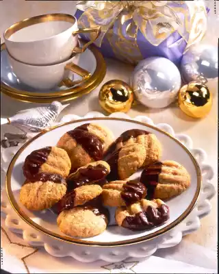 Place on two trays lined with baking paper and bake in a preheated oven (electric range: 175 °C/ gas: level 2) for 15-18 minutes. Remove and let cool on a cake rack. Chop the chocolate and put it in a small bowl with the coconut oil. Melt on a hot water bath. Dip each biscuit one-third into the chocolate. Drain on the cake rack and let dry
