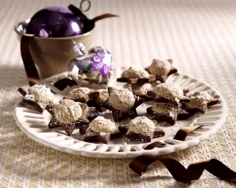 Mix flour, cocoa powder, icing sugar and salt. Separate the egg. Add egg yolk and butter in flakes. Knead first with the dough hooks of the hand mixer, then with your hands to a smooth dough. Cover and chill for about 1 hour. Roll out the dough on a floured work surface and cut out stars (5 cm Ø). Place on a baking tray lined with baking paper.