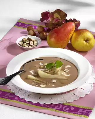 Drain the pears and cut them into slices. Pour soup and pears into deep plates. Put 50 g cream in streaks on the soup. Sprinkle with hazelnut leaves. Serve decorated with mint. The soup can be eaten hot or cold
