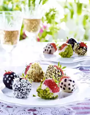 Turn the strawberries either in nuts or decorate with chocolate glaze. Leave to dry and use to nibble or to garnish a chocolate mousse.