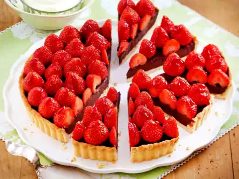 Wash and clean 600 g strawberries. Cover the tart with strawberries. Shortly before serving, heat up the jam and possibly 1 tbsp. water, fill into the disposable piping bag and cut off a small corner at the bottom.