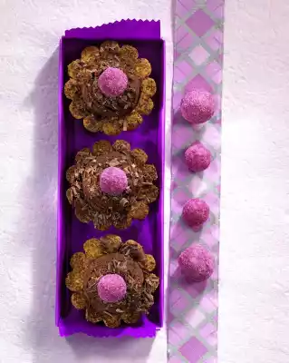 Press the dough into the form, prick the bases. Bake in the preheated oven (electric cooker: 200 °C/ convection oven: 175 °C/ gas: level 2) for about 12 minutes. Allow to cool slightly, turn out of the baking tins and allow to cool completely. Whip the cream briefly with the whisks of the hand mixer. Cut off the balls and place in the tartlets. Decorate each ball with a coloured truffle. Sprinkle with sliced chocolate