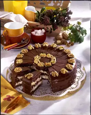 Coarsely chop the chocolate coating and melt in a hot water bath. Cover the cake all around with the chocolate coating and refrigerate for about 30 minutes. Press a cake divider for 18 cake pieces into the semi-dry cake surface. Take it off again immediately. Decorate the cake pieces and the centre with the remaining walnuts. Refrigerate for about 1 hour. Results in approx. 18 pieces