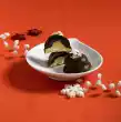 Warm the whole milk couverture and the white couverture separately in a water bath. Cover the balls with the full milk couverture and decorate with half a cashew nut. Coat chocolate sticks with the white chocolate and cover with the remaining pumpkin seeds.