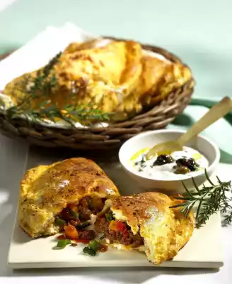 Garnish with set aside olives. Serve curd cheese with the empanadas. Garnish with rosemary and thyme.