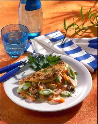 Season the sauce with salt and pepper. Heat the vegetables in the sauce. Slide the minced omelette onto a plate. Spread the vegetable ragout on top and fold over the omelette. Wash the parsley and, except for a little bit, chop finely and sprinkle over it.
