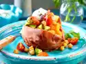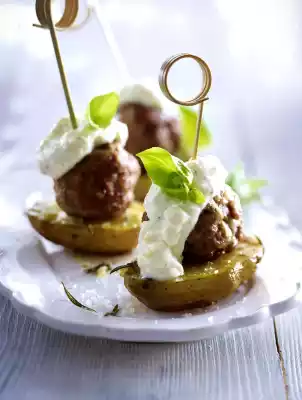 Remove the meatballs from the pan. Remove the potatoes from the oven, turn them on the baking tray and sprinkle the cut surface with coarse salt. Skewer 1 potato half and 1 meatball each with a blob of dip. Arrange on plates garnished with basil leaves