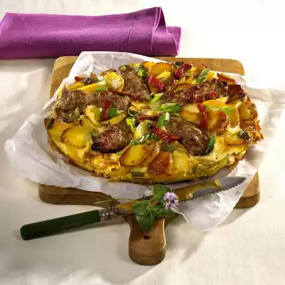Form 5 rolls from the minced meat mixture (approx. 10 cm long). Heat 1 tablespoon of oil in a pan. Fry the rolls for about 3 minutes on all sides, remove them. Add 3 tablespoons of oil to the pan and heat up. Fry the potatoes for about 20 minutes at medium heat. Season with salt and pepper. Clean, wash and cut spring onions into rings. Beat 3 eggs and milk. Season with salt, pepper and marjoram. Add spring onions to the potatoes.
