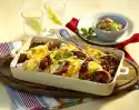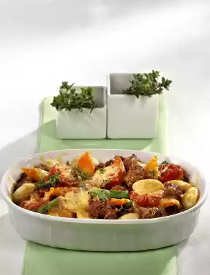 Season with salt and pepper. Add tomato sauce and mix well. Garnish with thyme except for a few stalks, chop finely and add to the sauce. Drain the white beans on a sieve. Wash cherry tomatoes, dab dry and cut into slices. Heat 1 tablespoon of olive oil in a frying pan. Fry the tomato slices briefly in it. Season with salt and place on kitchen roll. Lightly grease the casserole dish. Layer the chopped tomato sauce and vegetables in layers. Grate Gouda finely and sprinkle over the casserole.