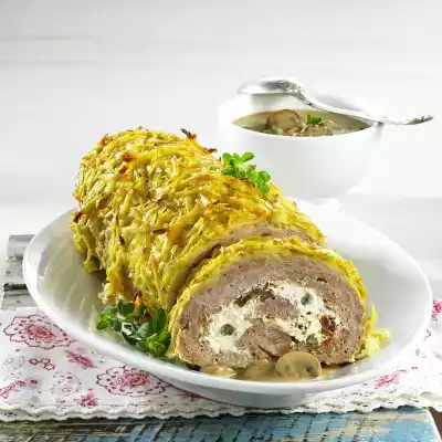 Sprinkle a thin layer of breadcrumbs on a work surface. Roll out the minced meat into a rectangle (26 x 31 cm). Add cream cheese and spread. Leave a rim of 2 cm each. Roll up from the long side. Place on a baking tray lined with baking paper. Peel and wash the potatoes. Roughly grate the potatoes and mix with an egg. Season with salt. Spread on the chopping roll and press on. Bake in the preheated oven (electric cooker: 200 °C/ convection oven: 175 °C/ gas: level 3) for 55-60 minutes. Cover if necessary after 30-40 minutes. Clean, trim and halve the mushrooms. Heat 2 tablespoons of tomato oil in a pan. Fry the mushrooms in portions.