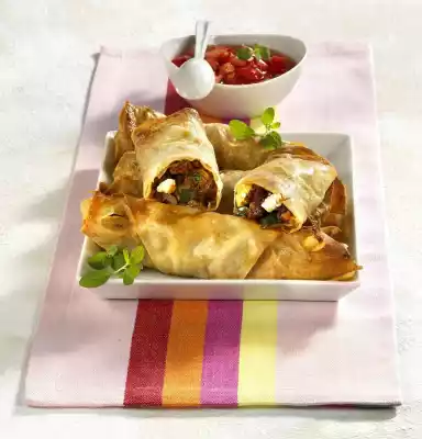 For the dip, wash, clean and seed the tomatoes and cut into small cubes. Mix tomatoes with chili sauce. Serve rolls with dip. Garnish with oregano put aside.