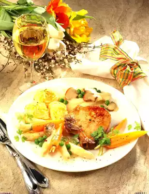 Drain the asparagus stock. Cook the carrots and asparagus pieces for approx. 15 minutes, drain and collect the stock. Heat the fat. Sauté the mushrooms and season with salt and pepper. Dust with flour. Add cream and vegetable stock while stirring constantly and bring to the boil. Flavour sauce again. Warm up carrots, asparagus and peas. Wash the chops and dab dry. Fry in hot oil while turning for about 10 minutes.