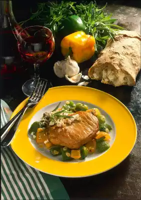 Remove from the pan. Heat the peppers in the pan and arrange the chops on top. Garnish with rosemary. Serve with fresh baguette.