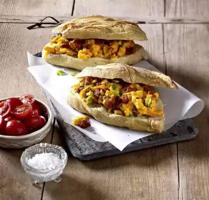 Add the egg mixture to the hot chorizo fat and allow to set, stirring occasionally. Season with salt and pepper. Wash and halve the tomatoes. Mix tomatoes, lime juice, sugar, salt and pepper. Cut rolls lengthwise in half. Spread some scrambled eggs on the undersides of the rolls, fold them together with the other half of the roll. Serve with tomato salad