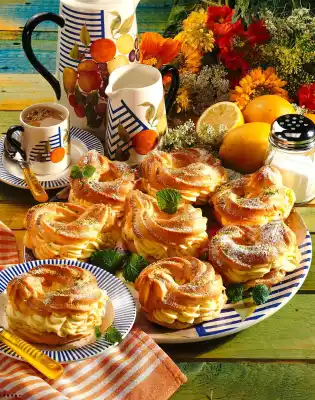 Let the pudding cool down a little. Stir in lemon zest and quark. Season cream with sweetener and fill into a piping bag with star-shaped spout and squirt onto the lower halves of the ring. Place the upper ring halves on top and decorate with powdered sweetness and ground pistachios