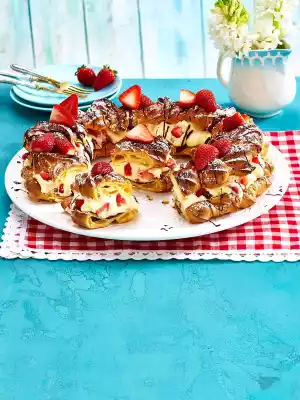 Place the choux pastry in a piping bag with a large star-shaped spout and squirt half of the pastry onto a baking tray covered with baking paper to form a wavy wreath (approx. 22 cm Ø). Spray the rest of the dough onto the existing dough ring in the same wavy shape. Bake in the preheated oven (electric cooker: 225 ° C/ gas: level 4) for approx. 30 minutes. (Do not open the door during the first 20 minutes!)