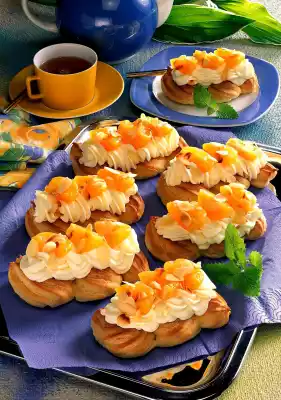 Pour lemon cream into a piping bag with star-shaped spout and squirt onto the strips. Drain the apricots on a sieve, cut them into slices and place them on the cream. Roast the flaked almonds in a dry pan until golden brown and sprinkle over the strips.