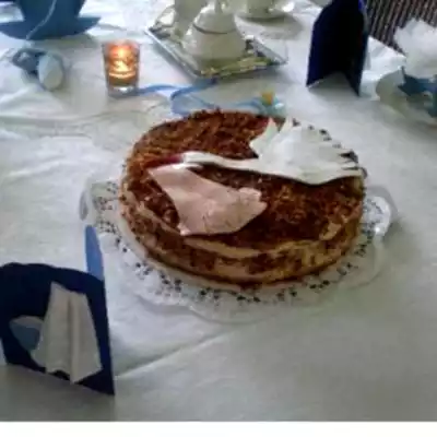 Melt the icing sugar to caramel and add the almonds ,pour it on an oiled baking tray and crush it with the rolling pin.sprinkle it on the cake.mix coffee and cocoa and pour it over the cake with a sieve.decorate it with the baptism symbol.