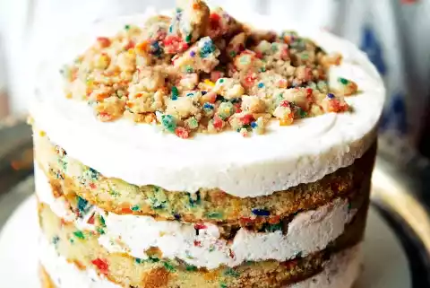 Mix flour, baking powder and salt, add to the egg-butter mix while stirring slowly. Briefly stir in 50 g colourful sugar crumbles. Put the dough into the baking frame, smooth it down and sprinkle with the remaining 25 g sugar crumbles.