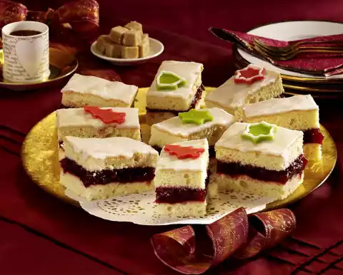Cut the cake into 16 pieces and decorate with the marzipan motifs.