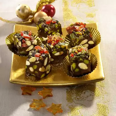 Roughly chop the chocolate coating. Melt the couverture, nougat and butter while stirring on a hot water bath. Cut the papaya into fine cubes. Add almonds, nuts and papaya and stir in. Season with vanilla flavour, pimento, nutmeg, cinnamon and cloves. Stir well.