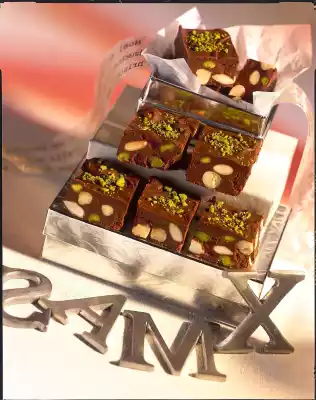 Roast the hazelnuts in a pan without fat. Rub the skin vigorously in a sieve with kitchen paper. Coarsely chop the couverture. Dice the nougat and butter and melt with the couverture in a hot water bath while stirring. Stir in spices, then fold in hazelnuts, almonds and pistachios