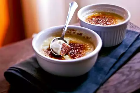 To serve, mix 6 tablespoons of sugar with cinnamon. Spread over the vanilla creams. Caramelise with the kitchen gas burner, swinging the flame slightly back and forth at a slight distance so that the sugar does not burn.