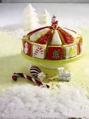Place cake pieces on top. Place the star on top of the cake, possibly fasten it with a toothpick. Decorate with a Santa Claus.