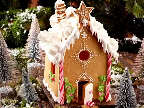 Place the small squares on top of each other with a blob of cast iron. Spray the roof in a snake-like manner with the cast, and put a thick blob for the chimney on top. Place the squares as a chimney on top of it (set at a slight angle). Decorate the roof with meringue tuffs and put the decorated star on top. Spray icicles on the edges of the roof and carefully remove the piping bag. If necessary, decorate with the remaining stars