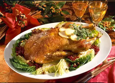 Bring to the boil. Stir in sauce thickener. Season with salt and pepper. Serve the goose garnished with apple slices and marjoram. Chop the nuts and roast them in a dry pan. Add cranberries and pour over the savoy cabbage. Pass sauce extra