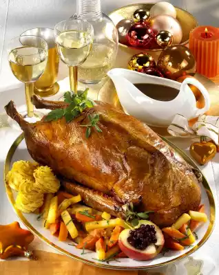 Pour the baking stock through a sieve. Dissolve the roast with a little hot water and pour into the stock. Degrease the stock and pour the goose stock from the glass. Bring sauce to the boil, stir in sauce thickener and bring to the boil again briefly. Refine sauce with cream and season to taste with salt and pepper. Fill apple halves with cranberries. Arrange goose with glazed turnip vegetables and filled apples on a large plate. Serve garnished with fresh herbs. Serve with sauce extra. Duchess potatoes taste good with it