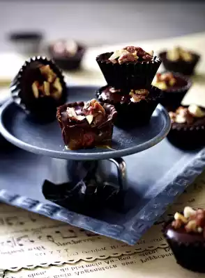 Coarsely chop the chocolate coating, melt over a warm water bath and let it cool down for about 5 minutes. Put a little liquid chocolate coating into each of the praline moulds and spread it by turning until the top edge is reached. Pour back any excess couverture and chill the praline cups for about 15 minutes. Repeat the process 1-2 more times. Finally, chill the moulds for 20-30 minutes