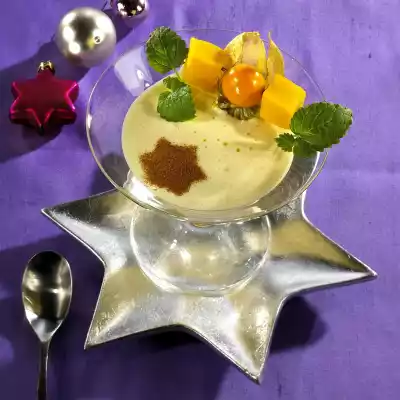 Put mango cubes and physalis alternately on skewers. Pour sabayon into glasses. Dust the sabayon with stars from the remaining cinnamon using a stencil. Decorate with fruit skewers and mint