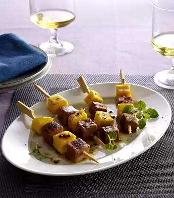 Cut, peel and dice the mango pulp from the stone. Put meat and mango alternately on skewers. Heat 1 tablespoon of oil in a coated pan. Fry the skewers for 4-5 minutes while turning, stir in the remaining marinade. Remove skewers, arrange on plates, garnish with remaining oregano